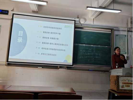 为进一步推动老年社会工作实务发展,提升养老服务专业水平,2025年12月8日下午,东莞理工学院24级社会工作专升本班开展老年服务领域实践专题分享会。经林寒老师邀约,东莞市正阳社会工作服务中心长者领域社工主任、塘厦镇综合养老服务中心主管陈彩玲,围绕老年社会工作核心场景,分享深耕多年的专业经验与服务策略,为学子注入实践动能。