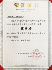 与此同时,在广东省法学会知识产权法学研究会2025年学术年会优秀论文评选中,付家慧、谢淯淮同学撰写的论文《新质生产力发展下的知识产权人才培养研究》荣获优秀奖。该论文立足新质生产力发展背景,探讨了知识产权人才培养的创新路径,得到了评审专家的高度认可。