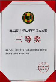 由庄瑞银老师、郑伊涵、王筱琪同学合作完成的《东莞民营中小企业出海的政策赋能路径研究》同样荣获三等奖。作品立足东莞民营中小企业深耕全球价值链的实际现状,聚焦企业出海政策供给、传导落地与资源配置现存痛点,围绕政策视角优化、提升政策可及性与强化资源配置效能开展实证分析,构建国内外双视角下分级分类辅导、平台协同发力的赋能路径,为优化东莞涉外营商环境、助力本土中小企业稳健开拓国际市场提供务实研究支撑,充分彰显学院师生立足地方、聚焦产业、服务发展的学术担当。